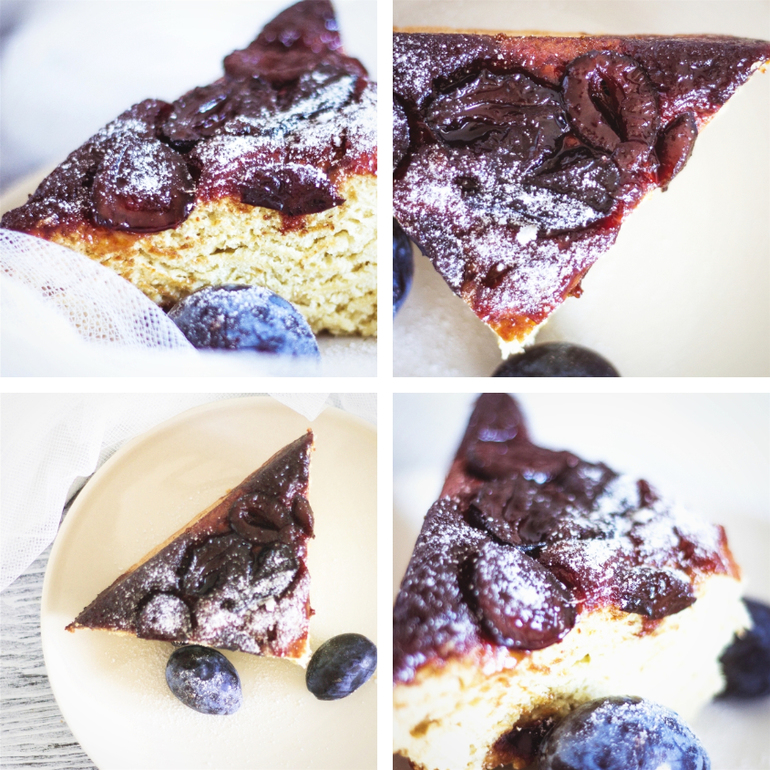 Сливы вымыть, разрезать пополам и удалить косточки. В сковороде со съемной ручкой растопить 75 г сахара. Как только сахар начнет темнеть, снять сковороду с огня. Разложить по дну половинки слив срезом вниз Растереть сахар с маслом, по одному добавить яйца. Перемешать. Всыпать муку, разрыхлитель и молотый миндаль. Вымесить однородное тесто. Выложить его на сливы, разровнять и в духовку на 180С на час. Пирог вынуть из духовки и дать постоять в форме 10 мин. Перевернуть.