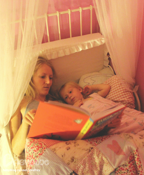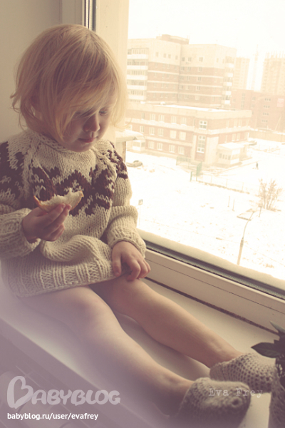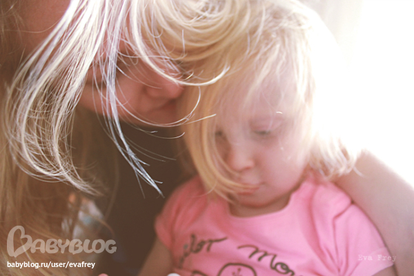 я конечно перевожу, но по-своему. Говорю, например что тетя сказала чтоб Мила послушная была и никуда не убегала, или что время домой идти и плакать не нужно. а она слушается и реально воспринимает в серьез. вот например идет вчера и ест банан, долго ест, отвлекается на все. И снова какое-то объявление.