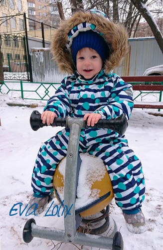 У Хуппы редко встречаются расцветки, которые мне нравятся, но бывают исключения). Да и люблю я одежду на детях не темных тонов. Конечно, я купила этот комбинезон. Взяла размер 80. Комбинезон идет с запасом +6. Утеплителя 300 гр. Хочу сказать, что комбинезон очень красивый, яркий. И я никого больше не видела в такой расцветке за всю зиму. Повезло... видимо))). Ткань плотная, но не грубая. Застегивается спереди на две молнии. На ножках и ручках у размера 80 есть отвороты. В этом году я снова решила купить сыну комбинезон такой же расцветки, но большего размера, потому что из старого мы выросли. Хочу добавить, что после нескольких месяцев носки комбинезона у него идеальное состояние, нет потертостей и других дефектов, как мне кажется). После долгих поисков мне повезло и я его нашла. На рост 90 см я взяла размер 92. Запас, конечно, есть. Короче, хваст)