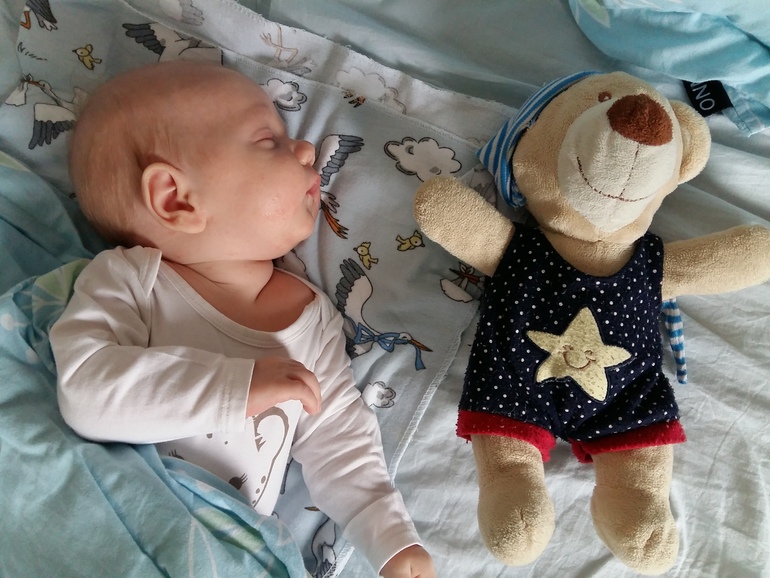 За прошедшие полтора месяца успели дважды пролечить глазки - из-за суженых слезных каналов гной тёк, подрезали уздечку под языком - плохо захватывал грудь, и укатили в первое путешествие за границу, где сейчас и находимся)