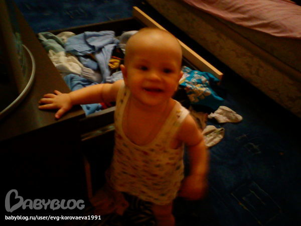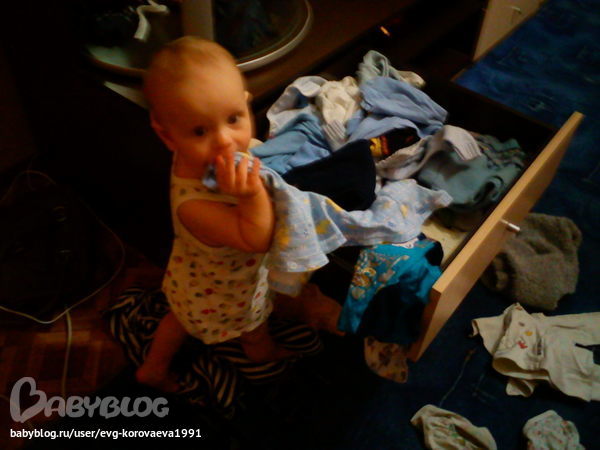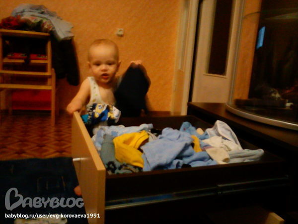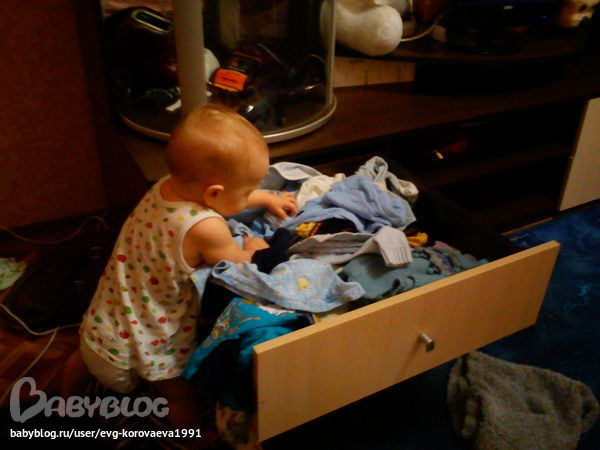 Моя маленькая шкода наконец то(очередной геморой на мою попу) сообразил, как открываются ящики с вещами.Но самое интересное, что наши с мужем он не трогает, только свои два ящика)) Я только все разложу , он следом ползет открывает и начинается салют из его вещей.. уже и не знаю, чтоб такое придумать, как бы отвлечь его от ящиков..с сумма сойду скоро..перед глазами за сегодняшний день одни ползунки, кофты, боди..