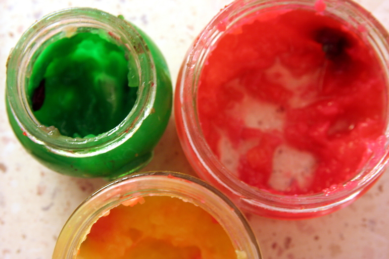 Были у нас магазинные пальчиковые краски двух видов, но они мне не нравились тем, что они не отмывались до конца. В итоге ребенок, одежда и ванна - все было в пятнах, которые не отчистить. Решили приготовить краски сами: