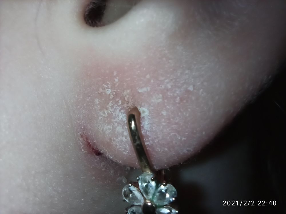 Ох, я бы к дерматологу сходила с таким. Похоже аллергия...на серьги или пищевая...врач вам лучше подскажет. У сына мокнущая ранка на складочке на правом ушке, серёжек нет, но похоже на ваше фото. Так вот у него пищевая аллергия, лечились у дерматолога, кроме диеты ещё была мазь гормональная. Так что мне кажется лучше пусть врач назначит лечение.