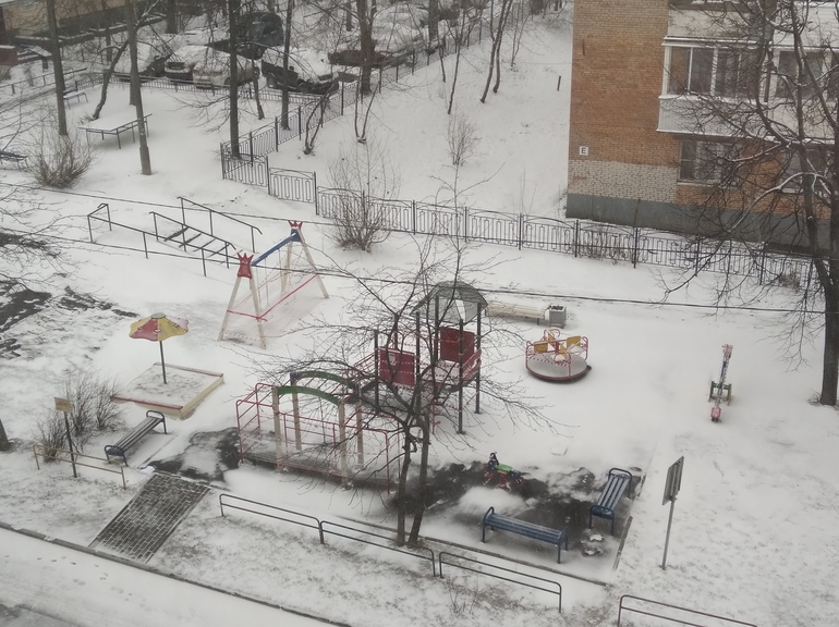 Людей на улице также мало. Детей не видно. Выпал снег накануне, холодновато и мокро.