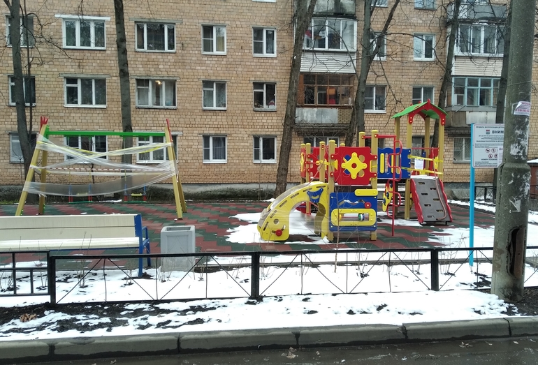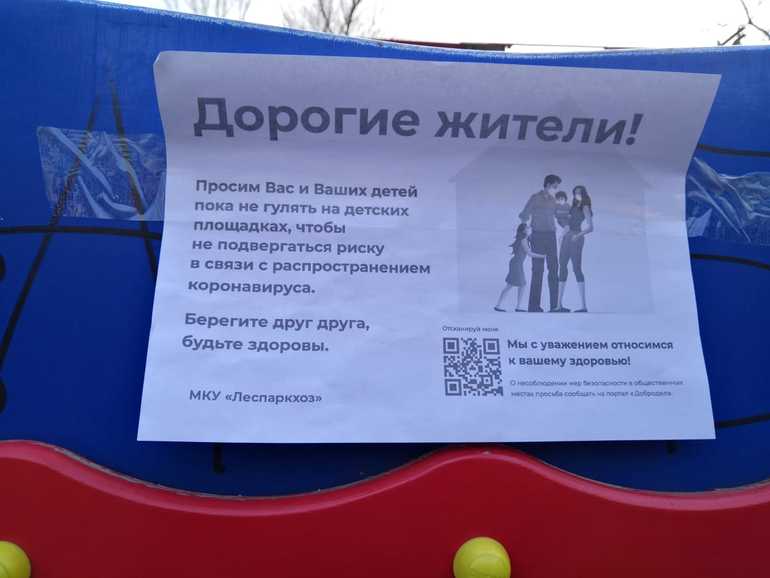 Детские площадки замотаны упаковочной пленкой поверх ограничительной ленты и дополнительно развешены предупреждающие объявления.
