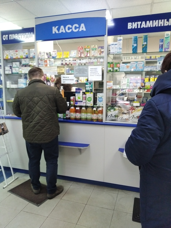 Над окном фармацевта висят 2 объявления, что надо соблюдать дистанцию и "Масок и антисептиков нет".