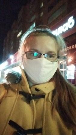 Вот так глупо выгляжу я, но успокаивает, что 70% пешеходов тоже в "наморднике". Правда похоже будто трусы на лицо натянула? :))))) Это я её сама сшила. Опытный образец. А ниже маски "на выход" трехслойные и двухсторонние.