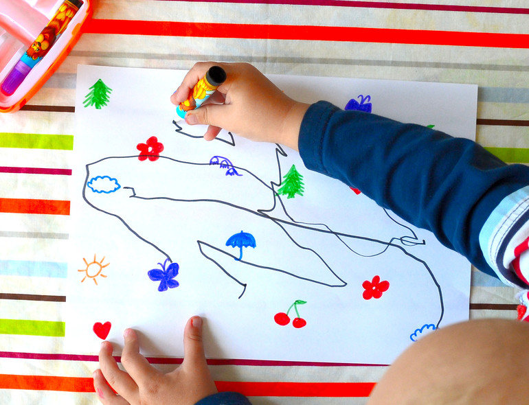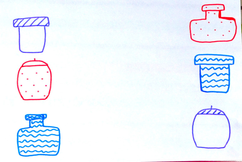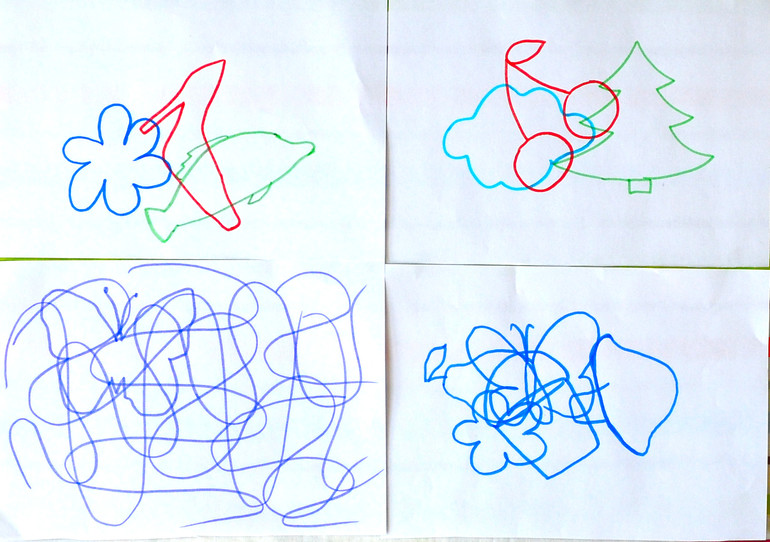 С этого мы начинали, совсем простое - увидеть туфельку, цветочек, рыбку. За пять минут такого добра можно нарисовать на месяц занятий.