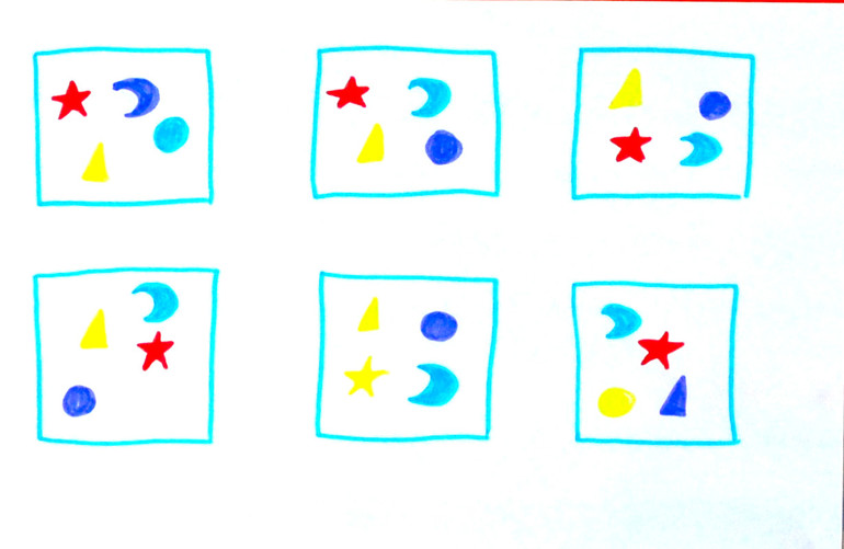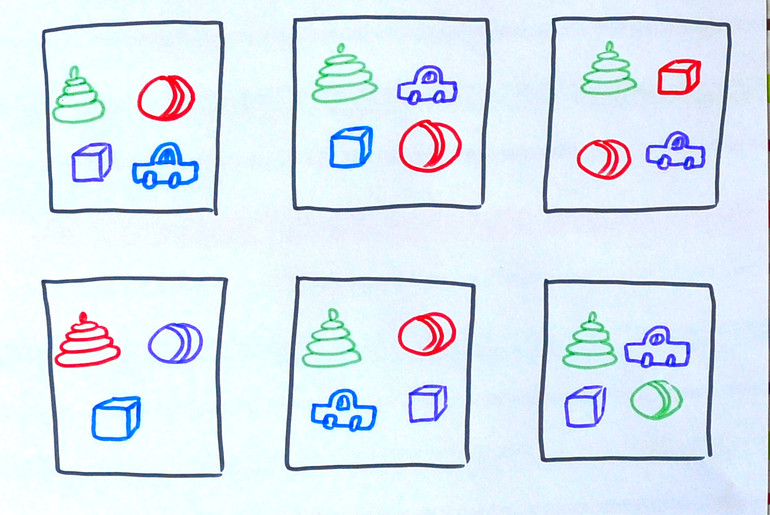 Найти коробочки с одинаковым содержимым, найти пару предмету, Найти предмет по двум или трём признакам.