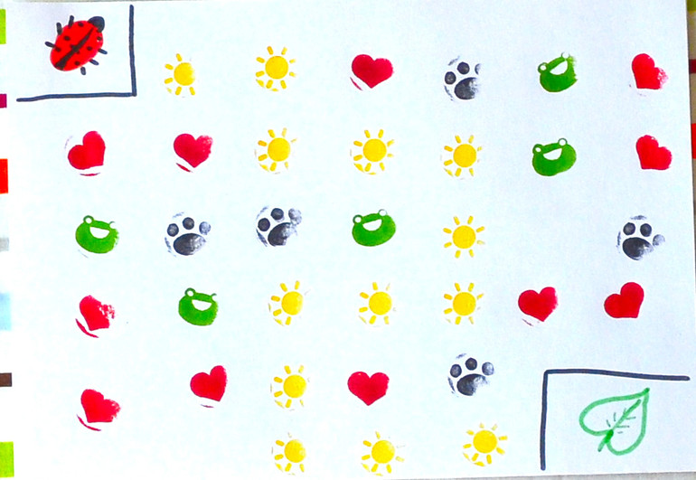 А вот со штампами. Максу провести божью коровку на листик по солнышкам а Варе - расставить штампы так, чтобы в рядах и столбцах они не повторялись.