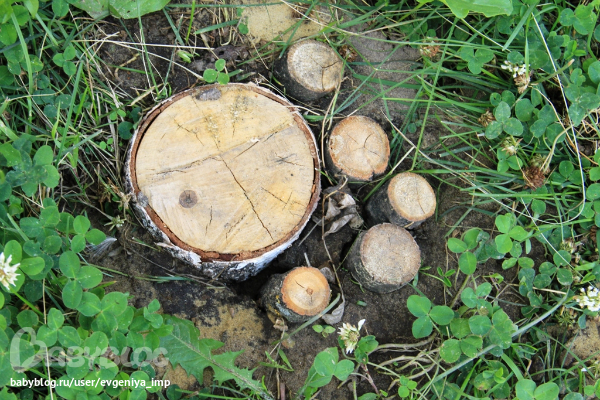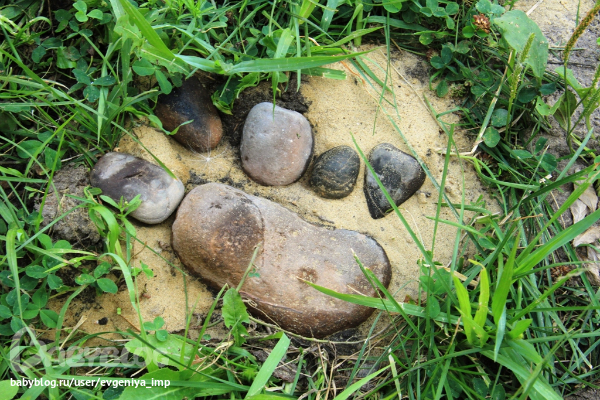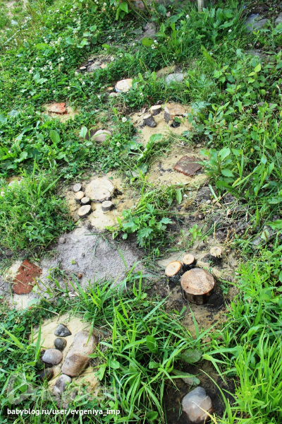 Сделала подобие массажной дорожки. Вкопала пеньки и камни. Позже обрастет травкой и будет красивее, но и уже сейчас она у Дани пользуется популярностью. Со словами :"мама, каме!" (камень) просится на нее походить.