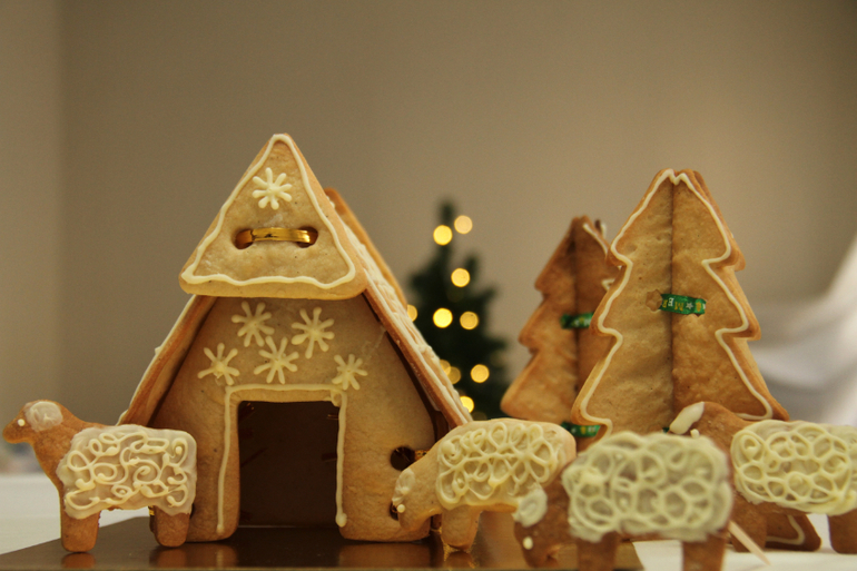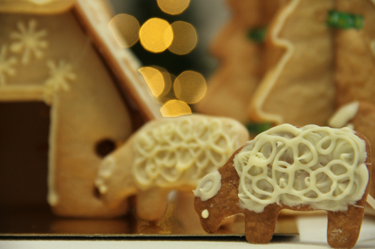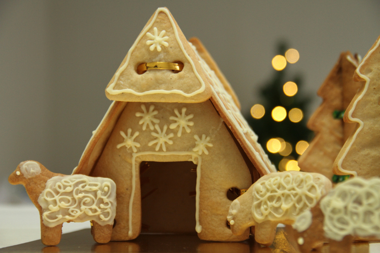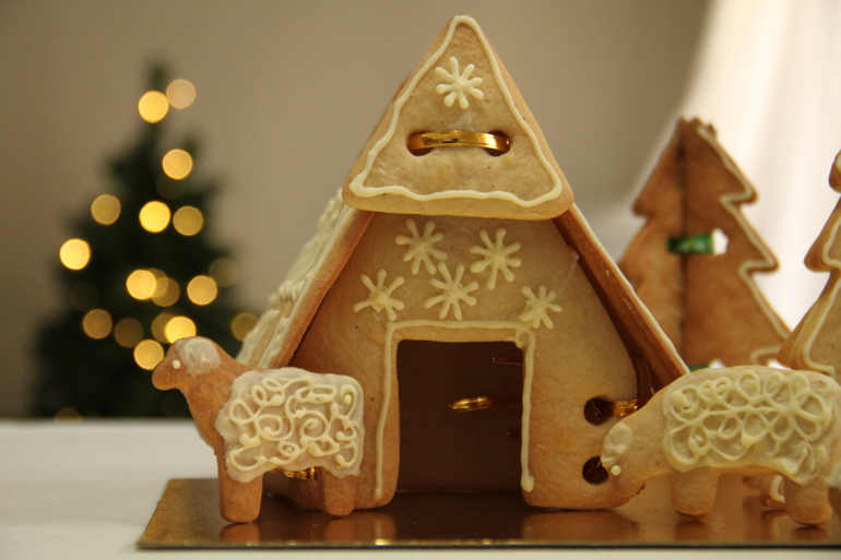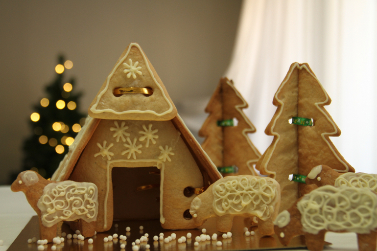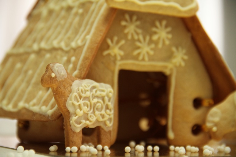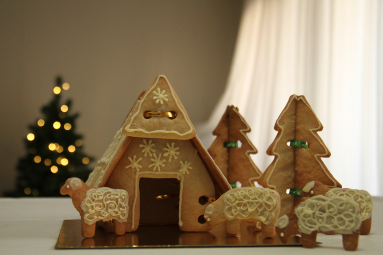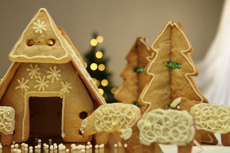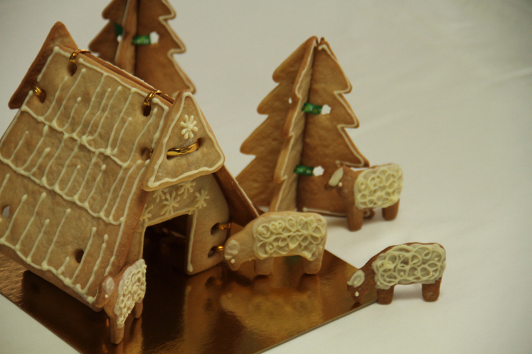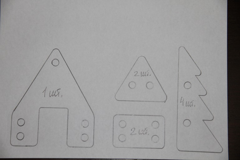 В этом году решила сделать пряничный домик, связывая детали лентой (декоративной леской). В прошлом году мне так не понравилось склеивать детали между собой. Роспись домика делала белым шоколадом уже в собранном виде. Собирать детали начала с помощью ленты, было очень не удобно и я отломила одну деталь от торцевой части. Хотела было все бросить, но вовремя одумалась. Склеила части шоколадом и связала декоративной леской. Заматывать ее намного проще, чем вязать узелки. Возможно, кому-то пригодится моя идея. Ниже я сделала фото схем, которые обвела на листе форматом А4 с формочек. Надеюсь, искажения в размерах не будет.