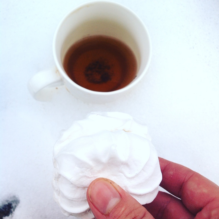 Мы приехали утром с рынка. Радислава выложила из слинга в коляску и он тут же заснул. Я погрела чай и вышла во двор с чашкой и зефиркой. Что может быть лучше чая на улице зимой :))
