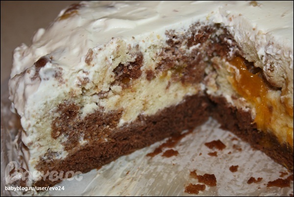 Проковырявшись в интернете и на ББ, а так же ориентируясь на присутствующие продукты в холодильнике, был приготовлен сей торт. Все, кто пишет, что он обалденно вкусен - не приукрашивают, это действительно так. Он сочный, пропитанный (при чем меньше чем за 2 часа), не приторный, нежный и тает во рту.
