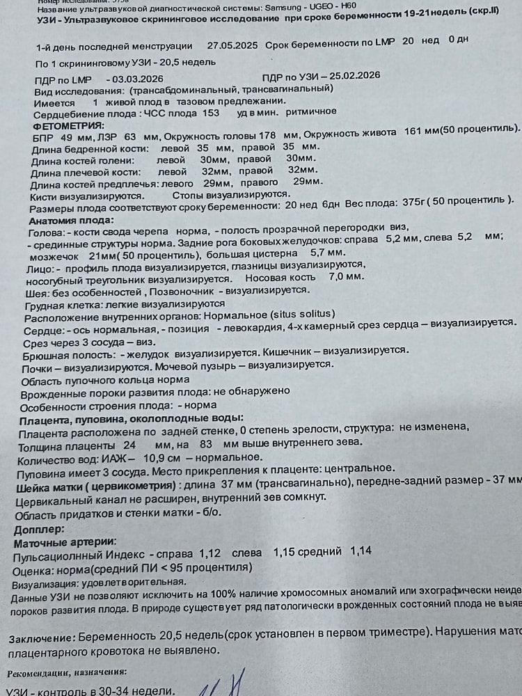 Были на повторном скрининге, сегодня ровно 20 недель, по узи на неделю она так и опережает, всё хорошо, всё в норме
