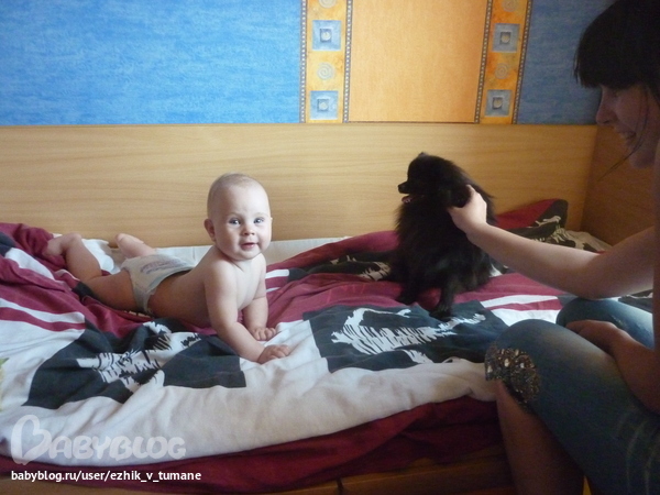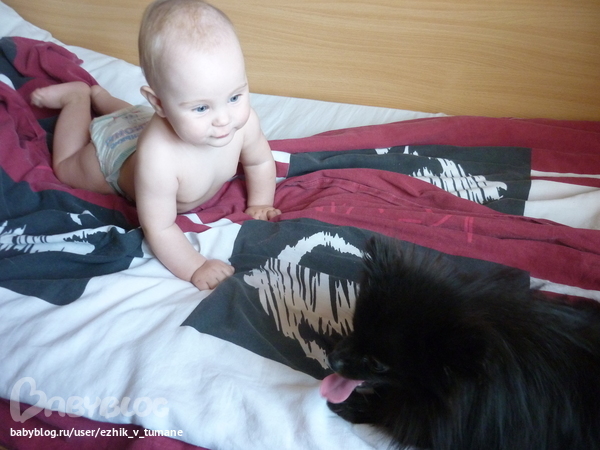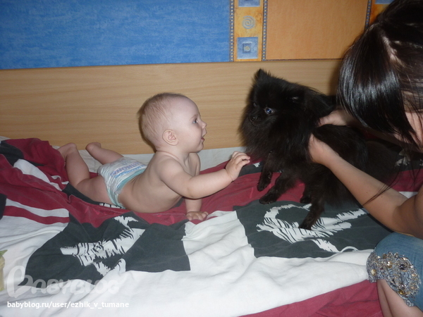 , дак еле успела отобрать а то уже в рот потянул, но иногда всеж собак огрызается когда малой ему пальцем в глаз попадает, а ума нет морду отвернуть