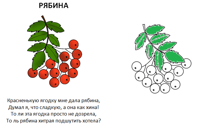 Рассказываем ребенку про ягоду рябину, обращаем внимание на цвета, читаем стихотворение и предлагаем дополнить картинку справа. Даем малышу отщипнуть кусочек пластилина, затем скатываем из него шарик и вновь возвращаем ребенку, чтобы он положил его в ягодку и раздавил пальчиком в кружочек.