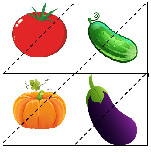 Собираем диагональные пазлы и изучаем тему "Овощи". Можно параллельно повторять цвета.