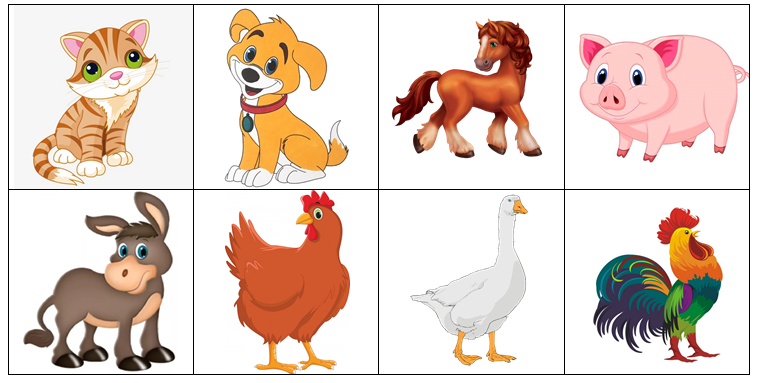 а) включаем запись звуков животных каких найдете и играете в угадай-ку. Если малыш не говорит, то пусть показывает пальчиком на нужное изображение. Вот таких животных можно взять для игры: