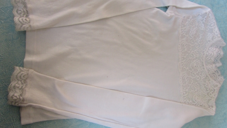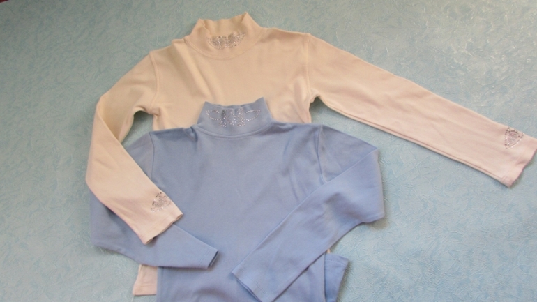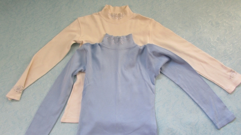 Водолазки голубая и молочная (длинный рукав)носили в школу Воротник стоечка,со стразами.Рукав 45-46 см,по груди 37 см длина 46-50 см.одеты по 1-2 раза.