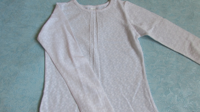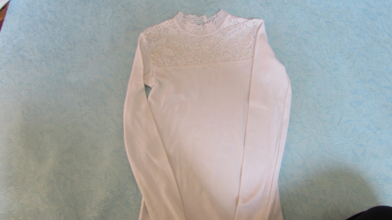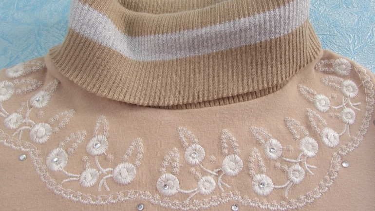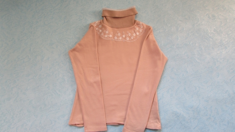 Водолазка цвет бежевый,очень плотный трикотаж,качественный,не растягивается при стирке,вышивка со стразиками по горловине,стрейч ,отличная ,носили 2-3 раза.