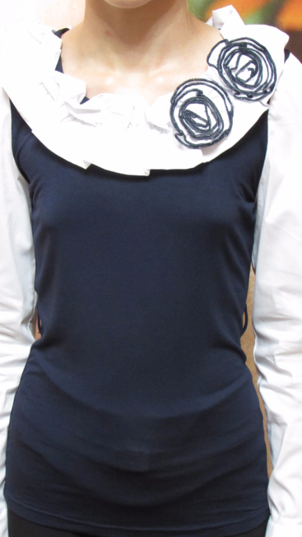 Перед,спинка блузки из плотного,приятного к телу трикотажа(стрейч)темно-синего цвета,рукава и ворот(рюши )из ткани рубашечного типа, х/б.Блуза удлинённая можно носить на выпуск с брюками например,или заправлять.По бокам имеются шлицы для пояса. цена -500 цена докризисная.Фирма Де салито.