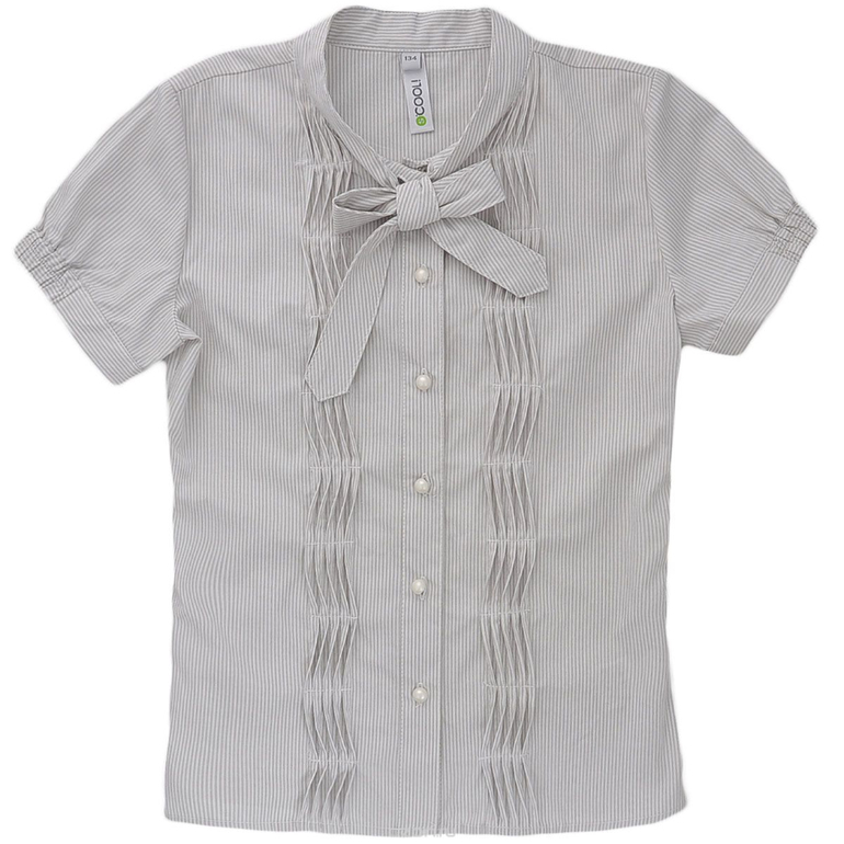 хлопковая блузка в полоску с коротким рукавом-фонарик застежка - пуговицы-бусины воротник-стойка оформлен бантом размер 158