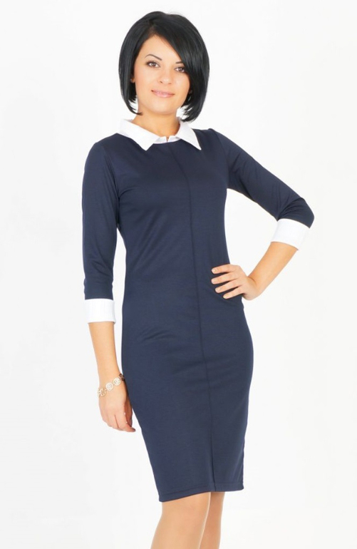 Платье строгого стиля, выполнено из плотного трикотажного полотна. Воротник и манжеты на рукавах контрастного цвета, рукава 3/4. Платье прилегающего силуэта. Перед платья украшен декоративным швом, который зрительно вытягивает силуэт, делая его стройнее.