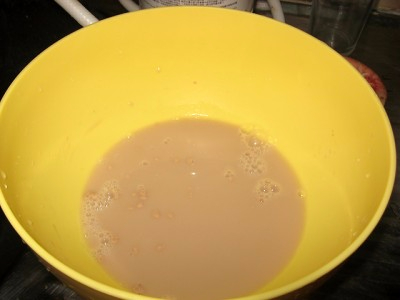 Налить в чашку стакан теплой воды и добавить 2 чайные ложки сухих дрожжей и еще щепотку сахара