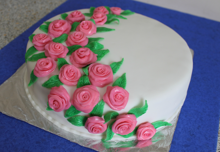 Леночка, спасибо, это мой второй тортик по счёту, который украсила мастикой. До этого украшала только кремом. Решила попробовать и вот результат. Я нигде не училась. Брала раскатывала по маленькому шарику мастики скалкой, очень тонко и моделировала уже розочки, лепесток по лепестку. Нужно было 19 розочек, сделала сначала 19 серединок, а потом по очереди, пока остальные подсыхают, беру следующую. Чтобы не сразу одна роза целиком, а то тает в руках.