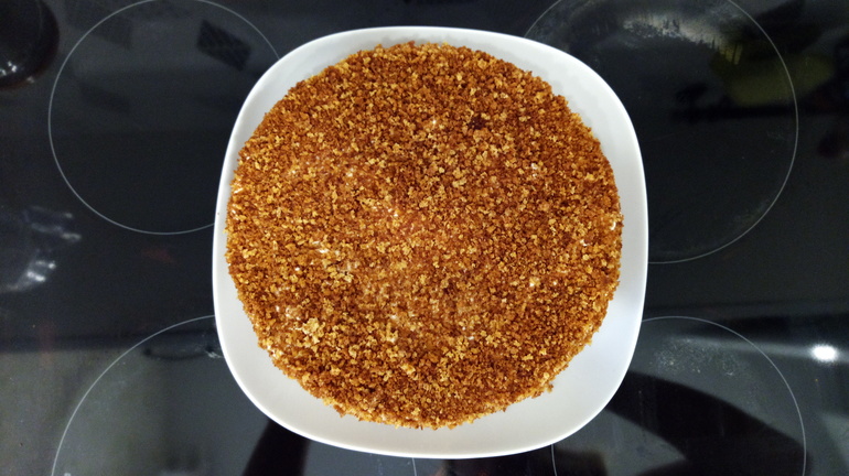 Крышку рвем в чашу блендера и измельчаем в мелкую крошку. Быстро и непрекращая мешать обжариваем на сухой раскаленной сковороде до едва затемневания. Главное - не сжечь, а подсушить.