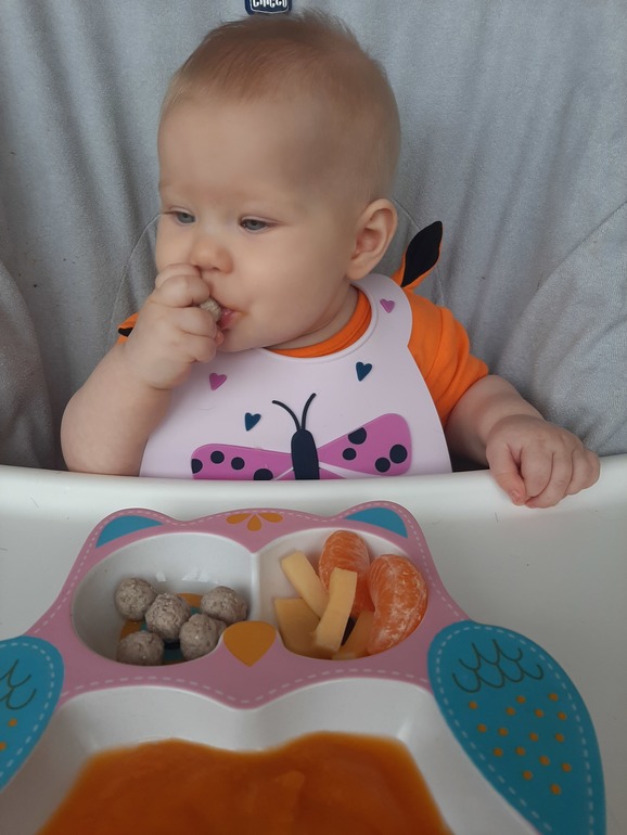 По цифрам не знаю. Вес примерно +200, зуб один, снов дневных два. Кормления обычной едой 3, один раз смесь, остальное грудь (ночь и раннее утро)