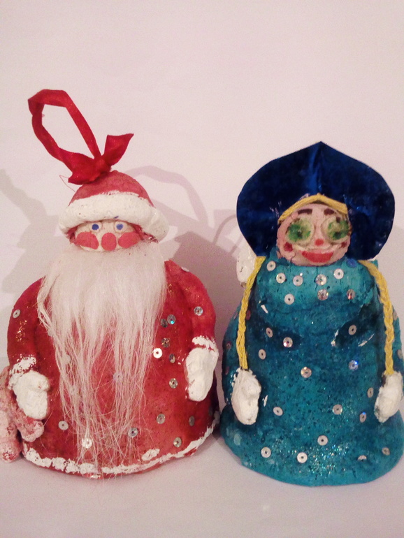 10. Ну и поделка в сад: Д.м. и снегурку. Делали из верха бутылки, соленого теста, украшали пайетками. Все с обоими детьми. У красотки снегурку тема сам делал лицо