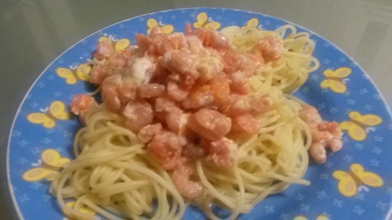 От него я сейсас не могу отказаться даже ночью ;)))) Это спагетти со сливочно- креветочным соусом. Осень вкусно, а самое главное оно ооочень быстро готовиться. Ну спагетти понятно как отварить. Приготовить соус не сложнее. Беру креветки чищеные, сливки 22% лук репчатый и морковь. В высокой сковороде нагреть сливки и высыпать креветки, добавить тертую морковь и порезанный лук, минут 10-15 подержать на огне и все готово :) Креветки беру мелкие, с крупными не так вкусно :) Приятного аппетита :)
