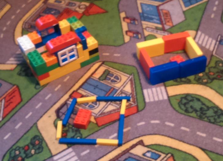 Кубики лего как заместители поросят очень хорошо были приняты - взяли разной длины, чтобы показать младшего, среднего и старшего брата. Построили им домики (фото), очень увлеченно строил, сам придумывал, рассуждал, что да как. На вопрос, как строить, если молоток исчез, сказал - кулаком!:)