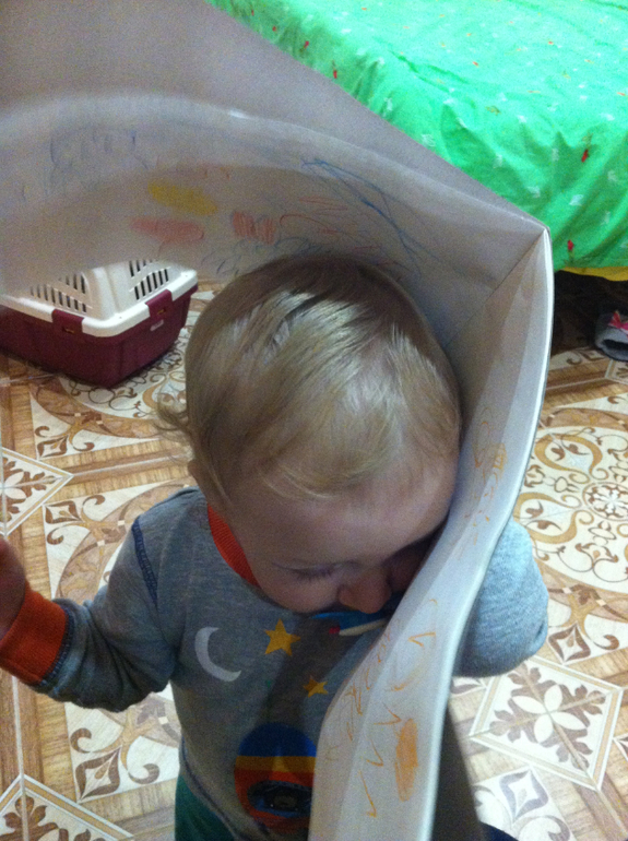 Из игр: очень любит танцевать, сам умеет включать себе музыку. Обожает ящики, одежду натягивает на голову и играет в привидение)) Любит и замечает все источники света, включает и выключает, совершенно не боится темноты и часто закрывается в темной ванне. Догонялки, хороводы, рулить и бибикать на толокаре, качели и горки на улице. Если кинуть подушку на пол - обязательно шмякнется в нее и будет валятся)