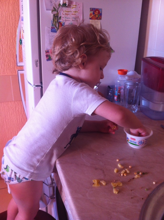 Стал помогать мне на кухне, когда готовлю или мою посуду, пододвигает стул и за компанию тусуется)