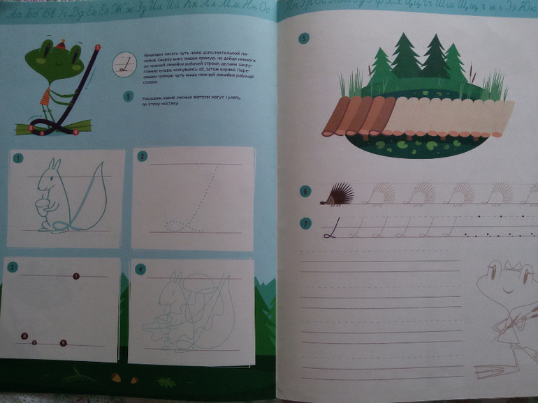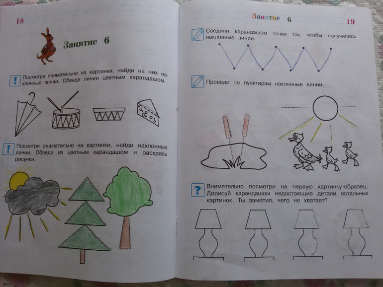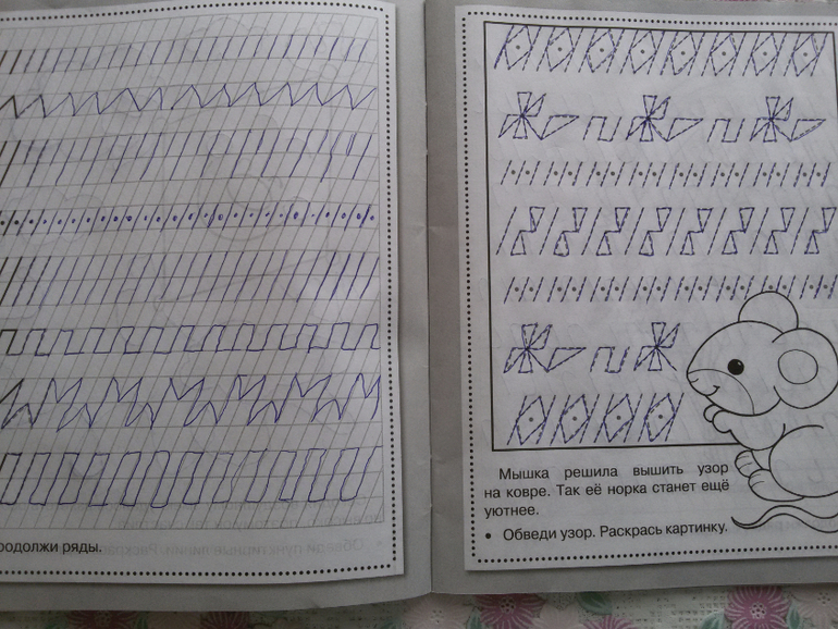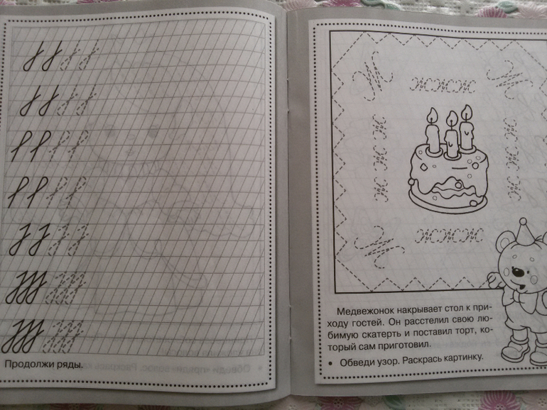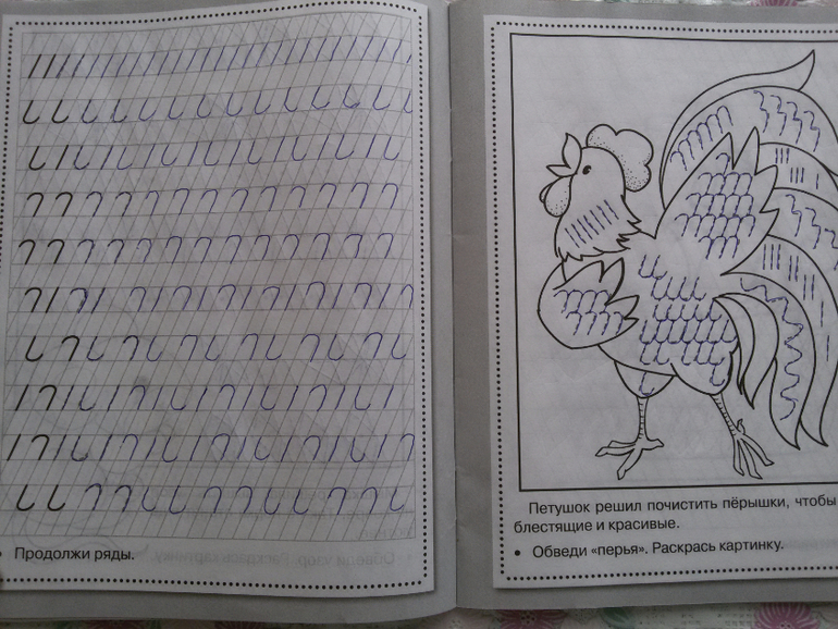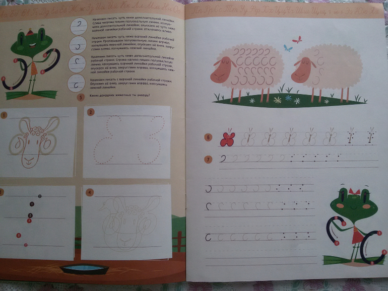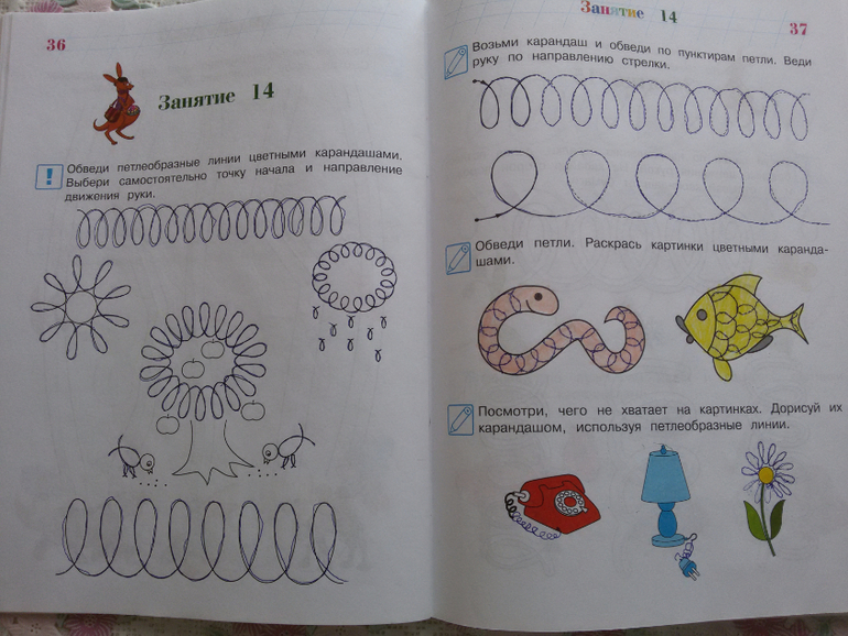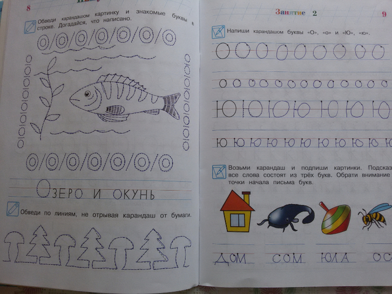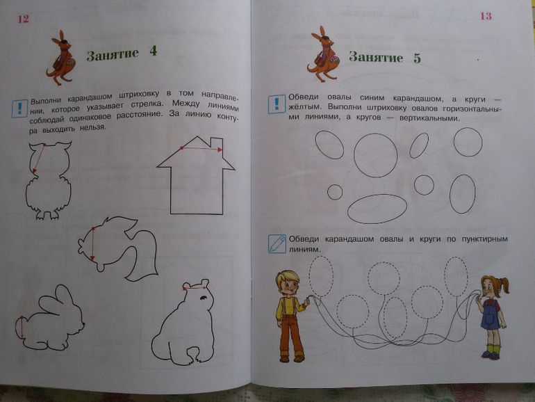 Первые несколько разворотов это повторение как правильно держать ручку, как правильно сидеть за столом и несколько разворотов на штриховку, раскрашивание, а обводилки присутствуют практически на всех страницах.