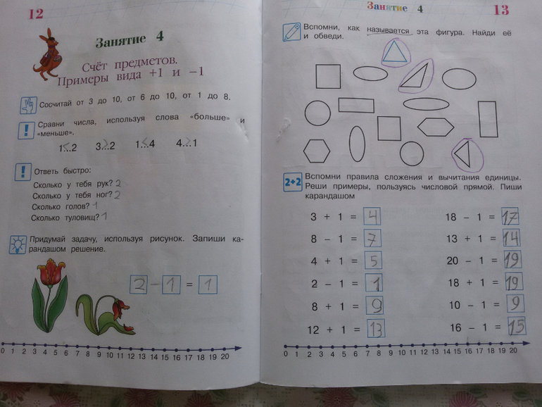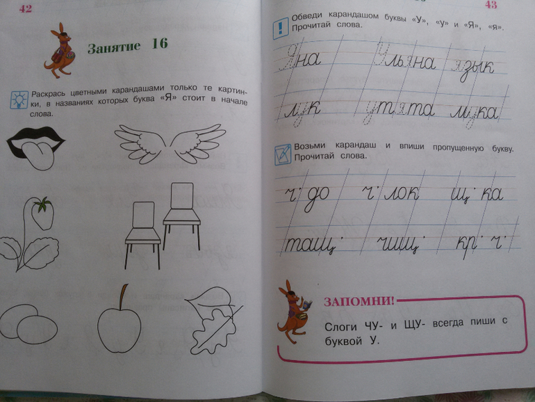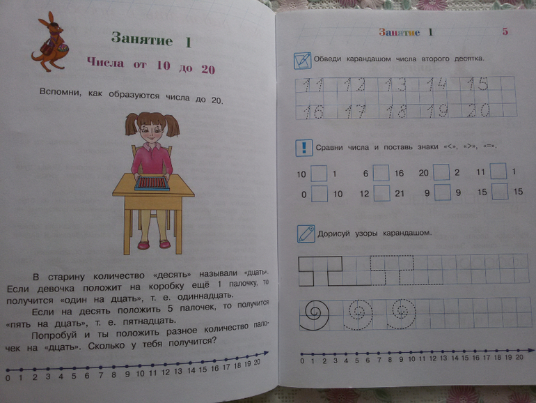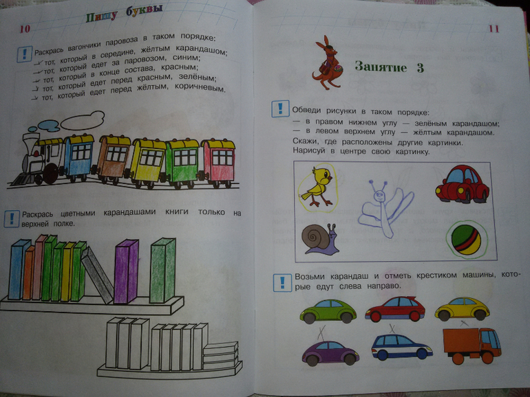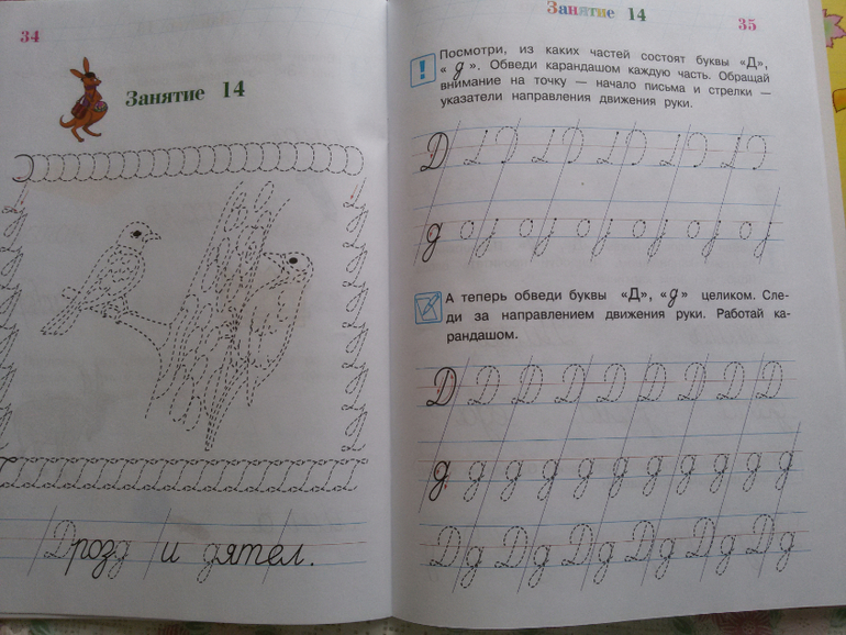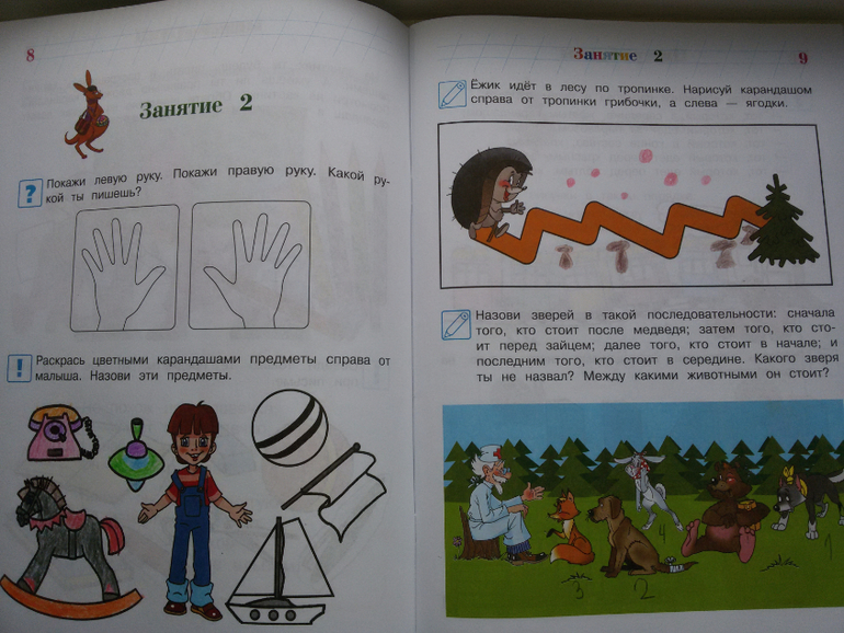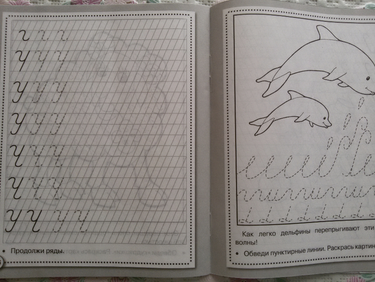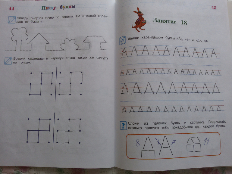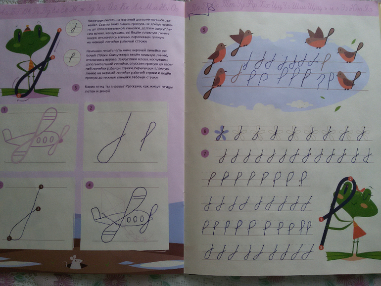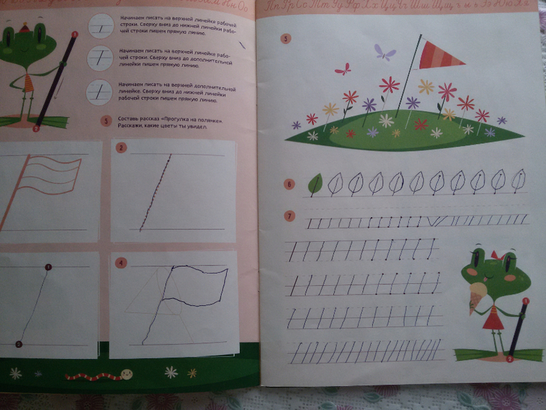 Первые несколько разворотов это повторение как правильно держать ручку, как правильно сидеть за столом и несколько разворотов на штриховку, раскрашивание, а обводилки присутствуют практически на всех страницах.