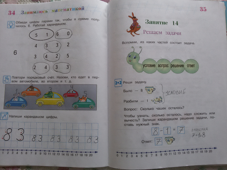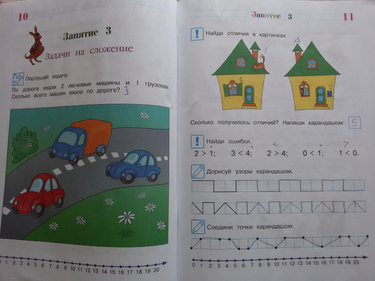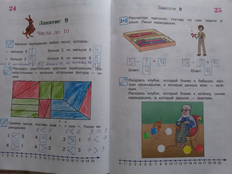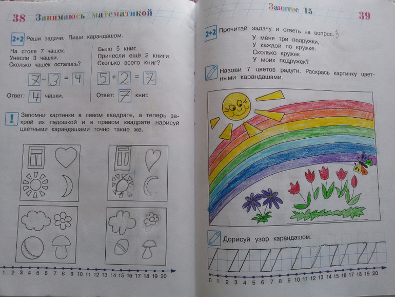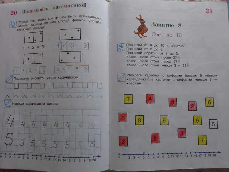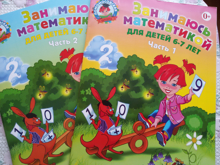 Тетради "Занимаюсь математикой" брала в соответствии возрасту указанному на тетради, потому что писать цифры, считать сын уже умел, представление о количественном выражении числа тоже имел. Задания в тетрадях разнообразные и выполнять их интересно. Нет однотипных заданий на 2-3 страницы, совмещаются письмо, раскрашивание, примеры, задачи на внимательность, таким образом, ребенок не устает.