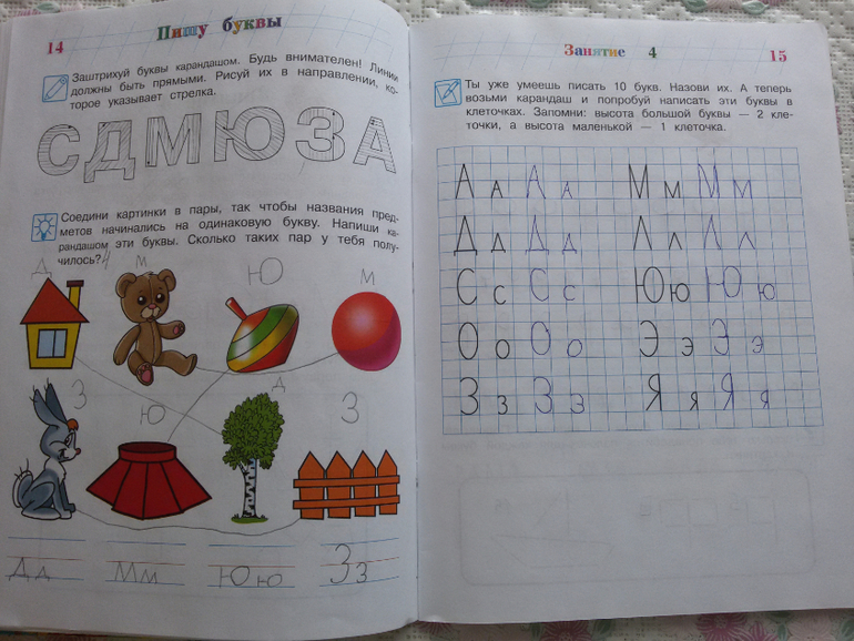 Буквы сын знает давно, печатные буквы и слова писать умеет, цифры и счет тоже знает, читать умеет, пока не бегло, но мы работаем над этим.