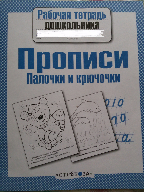 На пробу брала тетради издательства Стрекоза, серия "Рабочая тетрадь дошкольника". Стоимость копеешная, по нынешним меркам, 30-40 руб. Формат обычной школьной тетради, бумага тонкая, похожа на газетную с серым подтоном, но нам понравились тем, что там частая косая разлиновка, по ней легче писать палочки, крючочки и буквы. Все задания идут от простого к сложному. Пока я вояла этот пост, мы исписали эту тетрадь полностью и я заказала еще несколько.