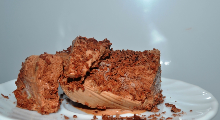 6.В остывшую шоколадно-ореxовую массу вводим 1/3 от сливочно-белковой. Аккуратно перемешиваем и добавляем остальную смесь. Быстро и нежно перемешать, разложить в форму и поставить в морозилку на 8 часов, а лучше на всю ночь.