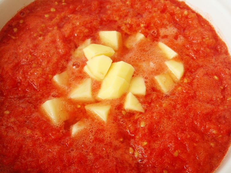 1. Помидоры ошпарить, снять кожицу, измельчить в блендере, либо натереть на тёрке.