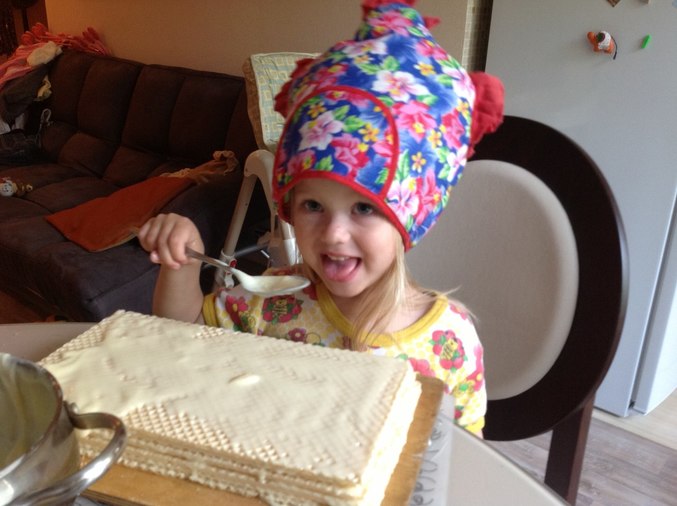 Что у нее на голове?Это прихватка-петушок.Как только мы стали мазать крем,волосы сразу попали в сгущенку и я стала Злате напоминать,почему у всех поваров на голове поварской колпак.Доча не растерялась и придумала себе свой колпак!