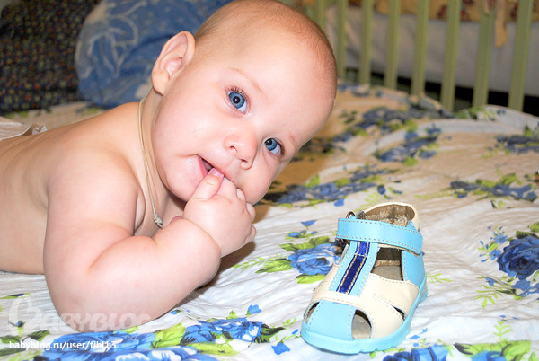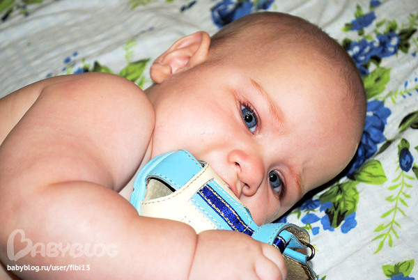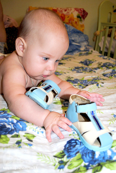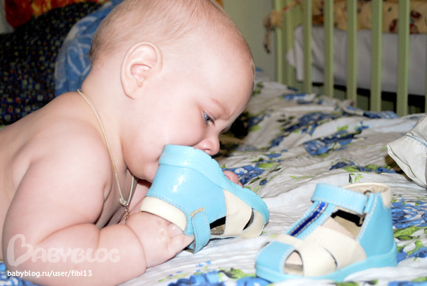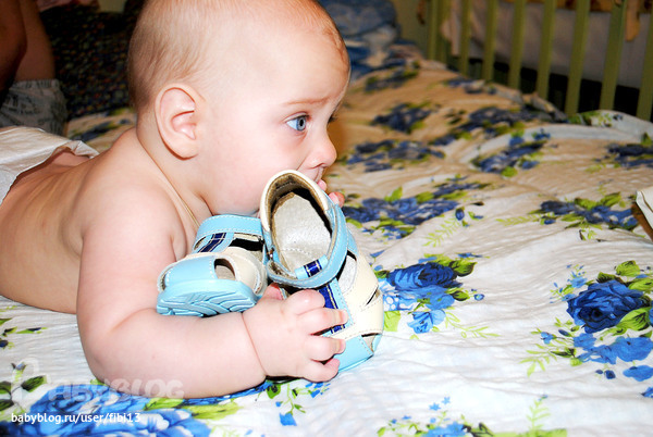 Вчера сынульке купила первые топотушки, на размер побольше (18 р), чтобы и осенью поносил еще...пришли домой, положила их и пошла делами заниматься...А этот проказник, подполз к коробке, открыл ее и начал обувь кусать))) мы с папой долго смеялись))))