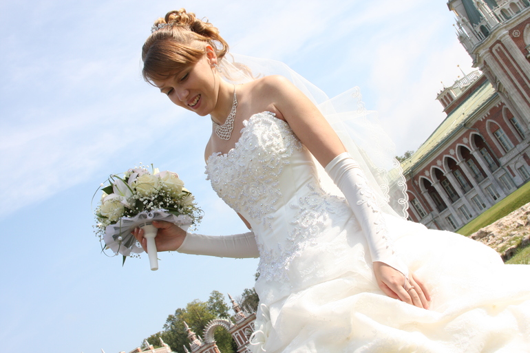 Состояние отличное, после химчистки. Цвет Шампань. Корсет украшен стразами Swarovski, юбка украшена бантами, бусинами, стразами Swarovski. Сзади шнуровка. Платье дорого смотрится на невесте. В подарок - фата и перчатки.
