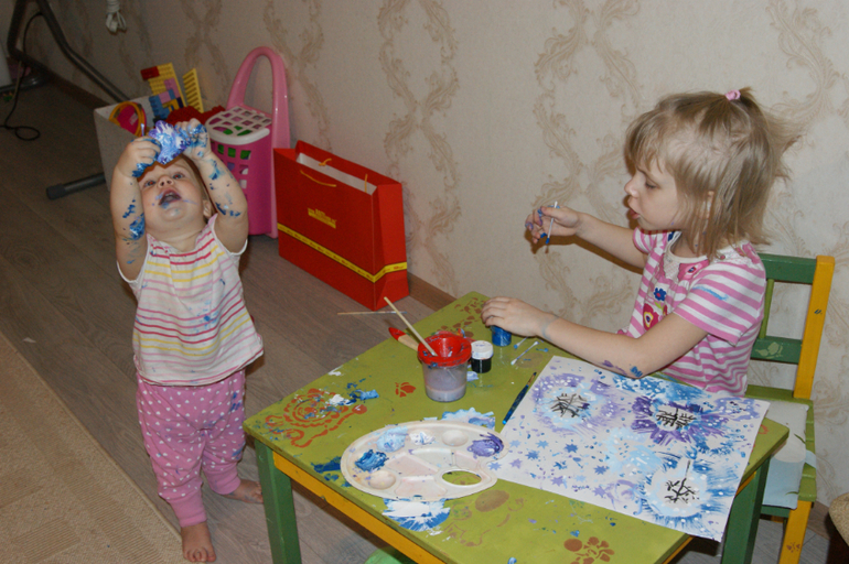 А может это я не очень люблю, поскольку Агуша тут же бросает все свои дела и тоже бежит рисовать. Я пытаюсь спасти мебель, обои, и ковер от жесткой покраски начинаю нервничать, давить и торопить Риту, она тоже начинает дергаться и в итоге ничего путного красками не выходит. А карандашами сидит и рисует в свое удовольствие.