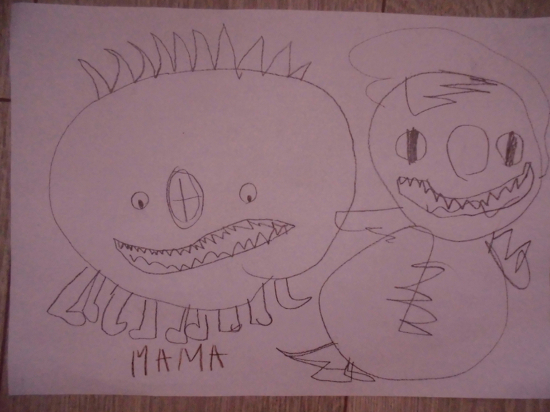 Это наш папа пугает Риты всякими чудищами, а Рита их рисует (Пликокока и Плисисика и мама почему-то))