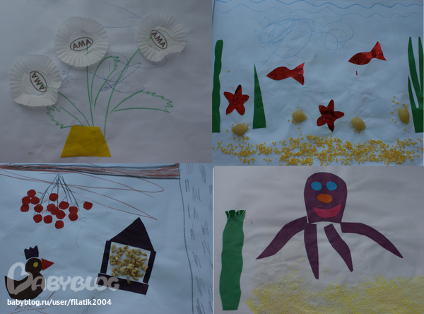 Наши работы с аппликацией. Больше всего Ритусе нравится посыпать зерно и подрисовывать везде глазки!